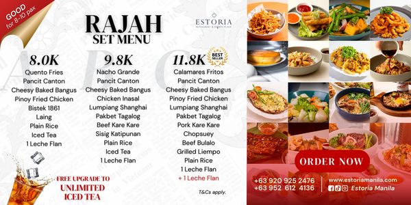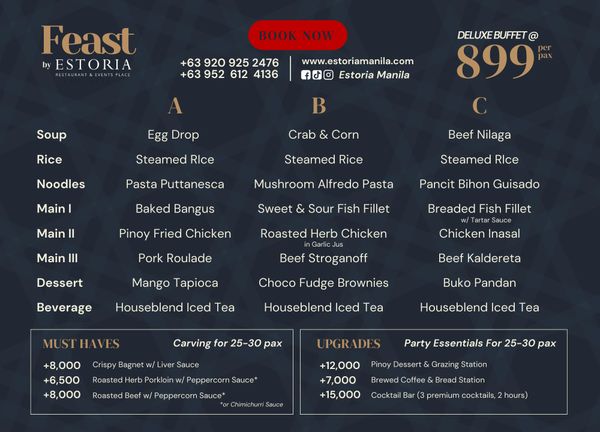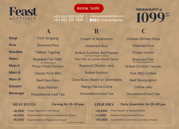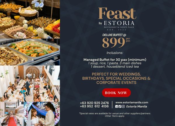 Special rate for Buffet catered by Estoria Kitchen is P 899/pax, minimum of 30 pax.